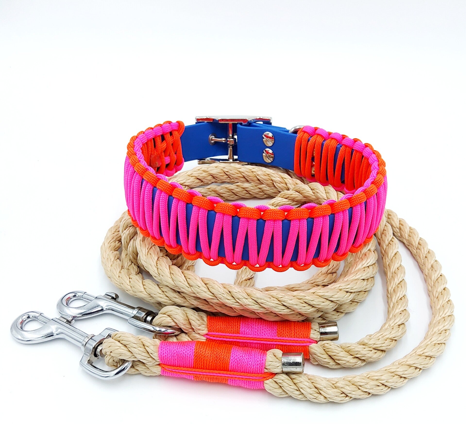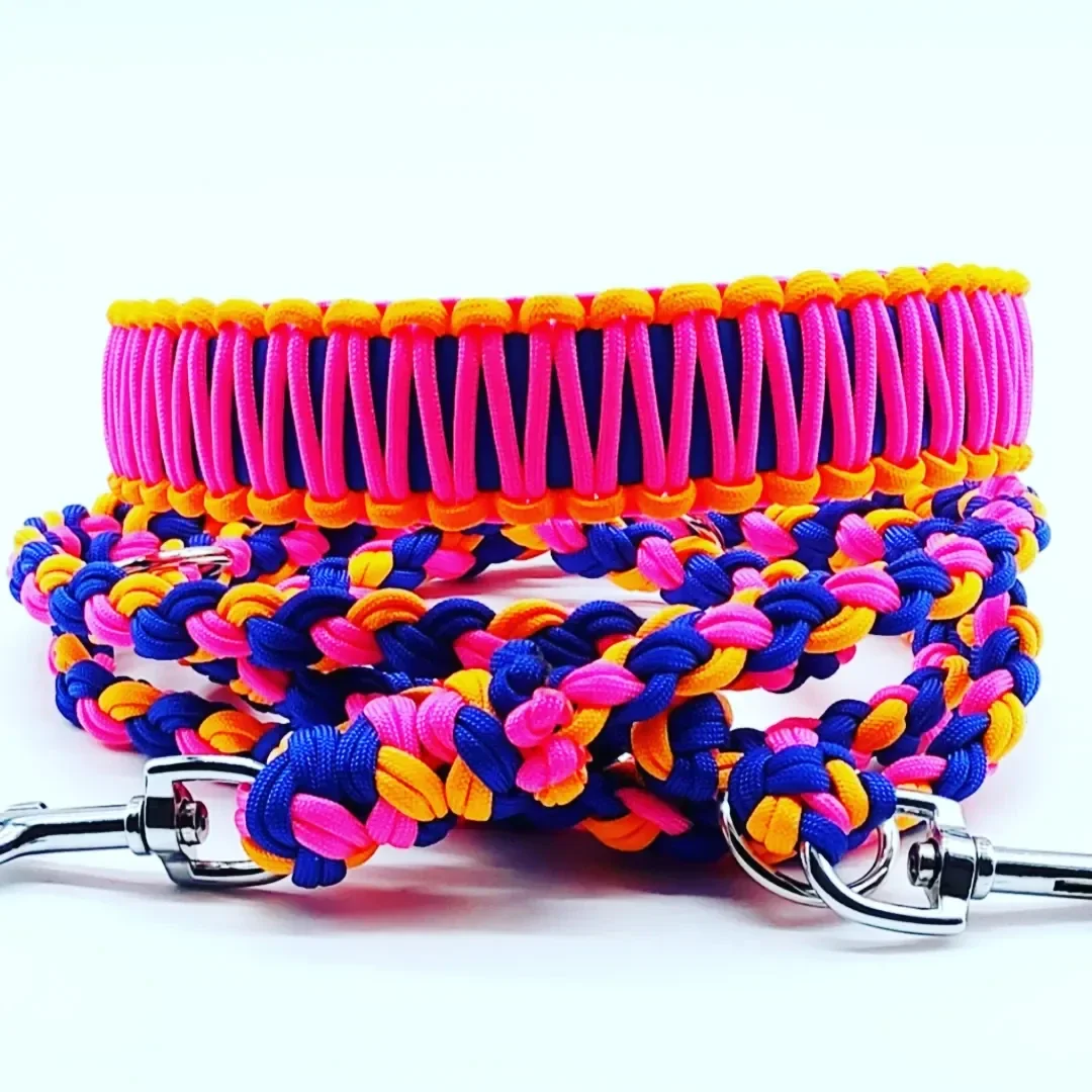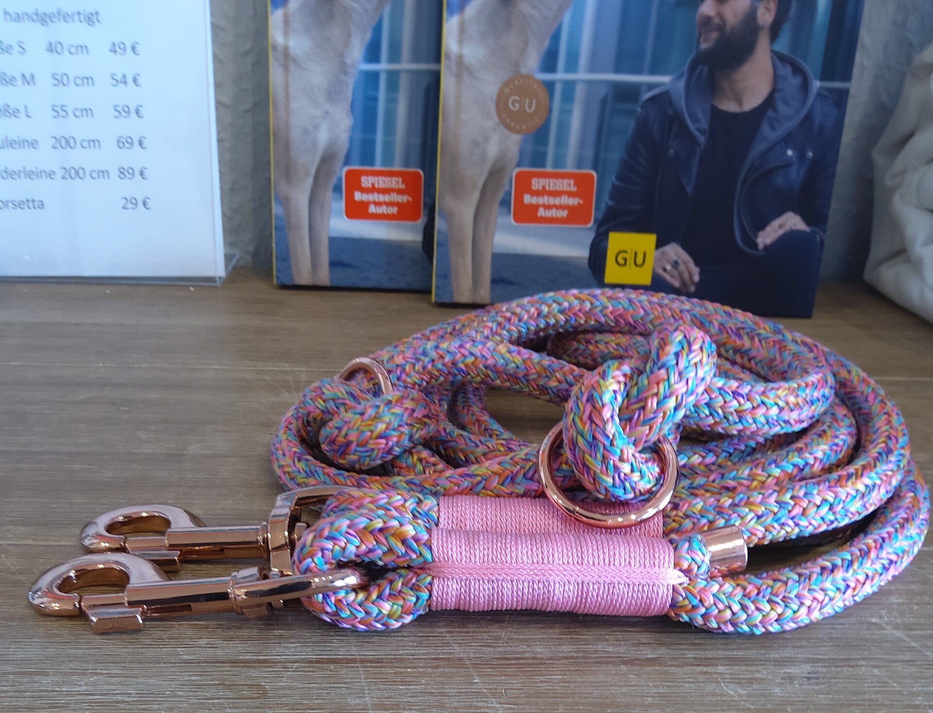Alles begann mit der allerersten Retrieverleine (siehe erstes Foto). Was zunächst als einfacher Einstieg in die Welt der Halsbänder und Leinen begann, entwickelte sich schnell zu einer echten Leidenschaft. Je tiefer ich mich mit dem Thema beschäftigte, desto mehr Varianten und Techniken konnte ich erlernen und umsetzen. Hier sehen Sie chronologisch meine Entwicklung – von den ersten handgefertigten Stücken hin zu immer vielfältigeren Designs, die Funktionalität und Ästhetik miteinander verbinden.